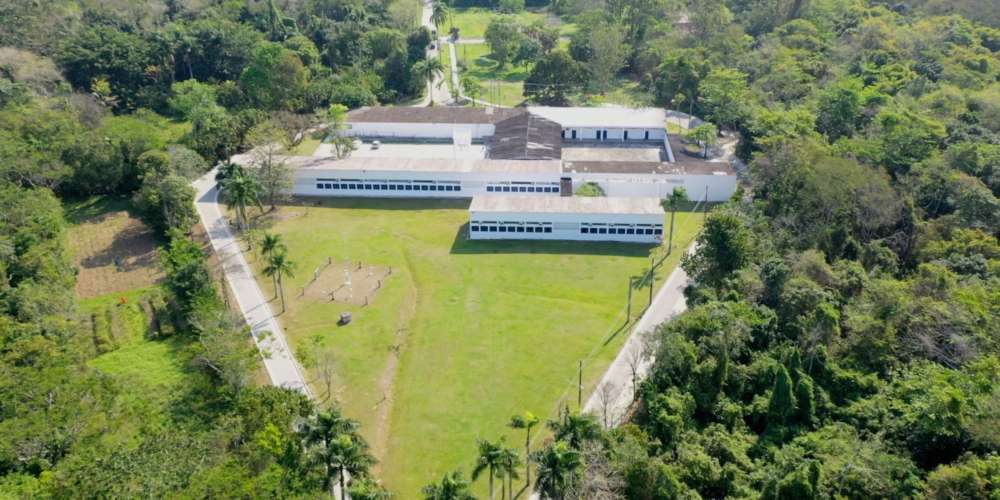 Vista aérea do Pavilhão Olympio da Fonseca Filho, sede administrativa da Fiocruz Mata Atlântica, destacando a arquitetura e a integração do edifício com a paisagem ao redor.