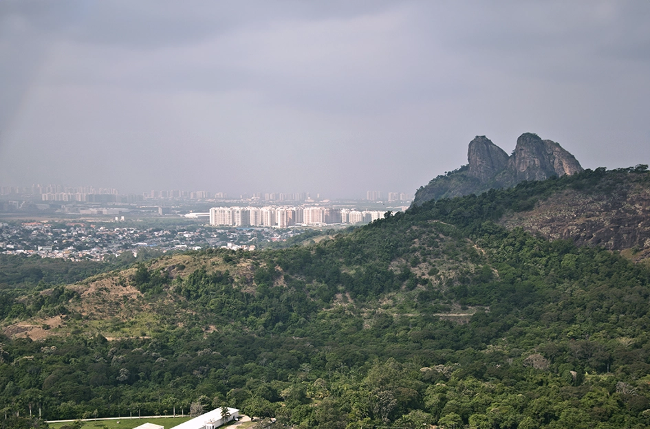 Vista parcial do campus Fiocruz Mata Atlântica, capturada a partir do Morro da Pedreira, destacando o Morro Dois Irmãos e a baixada da Barra da Tijuca ao fundo.
